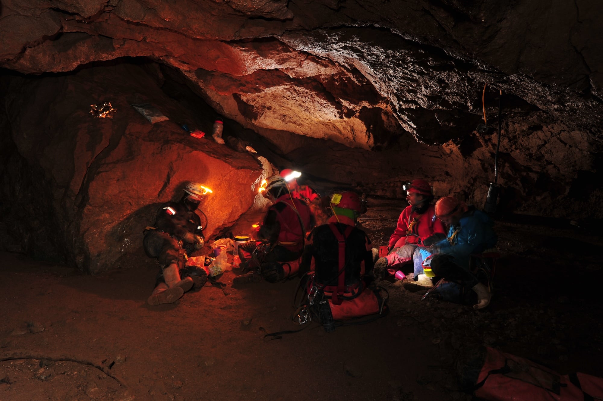 We are a few cavers of a country, which, although having a karst surface area of about 300,000 km2, larger than the total surface areas of many other countries, only has 3,000 known caves and 60 cavers and started caving as ridiculously late as 1960, whose federation was only partially formed in 2010 and currently has about 20 caving organizations due to their ongoing conflicts and splits